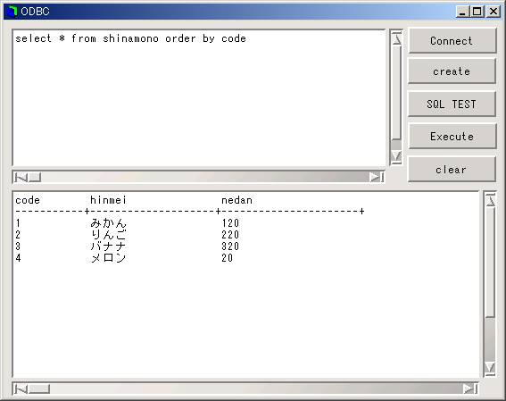・「create」ボタンはテスト用のテーブル shinamonoの作成とテストデータを作成します。