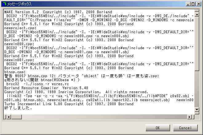 ・WideStudioを起動し プロジェクトを読み込み、[プロジェクト]-[プロジェクト設定]の基本設定タブでプラットホーム互換をクリックしプロジェクトを保存し再度読み込んでください。これで、BCC5.5.1又はVC++6.0でコンパイルできると思います。