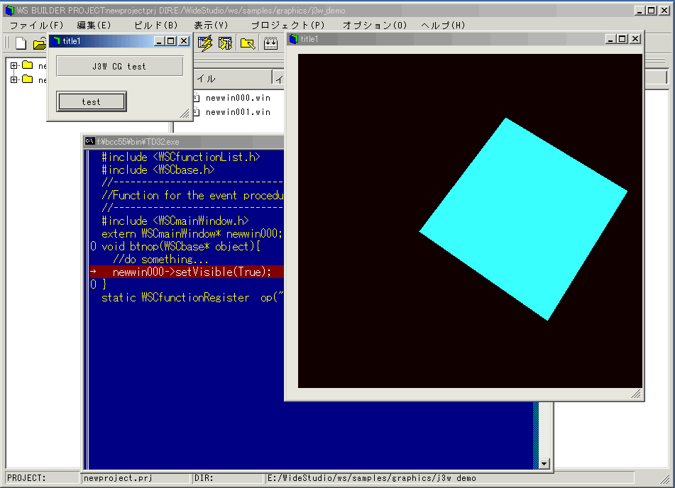 ・サンプル j3w_demo をBCC5.5.1でコンパイルした所、漢字の所が文字化けしていますが、動作には支障はありません。